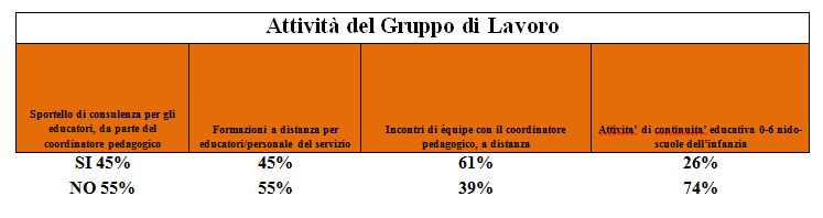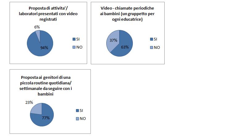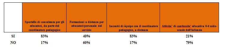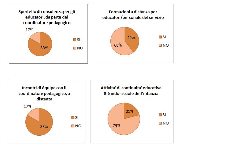 E’ con queste molteplici finalità che la maggior parte dei servizi, anche con attività a distanza, hanno realizzato incontri, da remoto, di équipe e si sono avvalsi della consulenza dei propri coordinatori pedagogici.