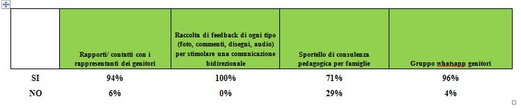 I dati mettono in evidenza quanto i genitori siano attenzionati dai servizi educativi per la prima infanzia della zona educativa pisana; anche in tempo di chiusura delle strutture, sono state particolarmente curate le forme di partecipazione delle famiglie, che sono state supportate sia dagli educatori, che da professionisti con specifiche competenze; la famiglia è infatti considerata dai servizi della zona parte integrante del sistema educativo e ciò è evidenziato da quanto realizzato.