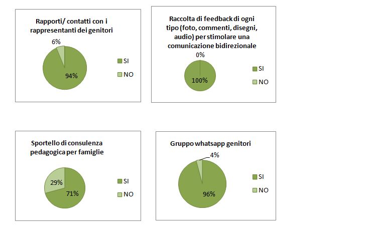Le Scuole dell’Infanzia hanno cercato in più modi di sostenere le famiglie nel loro ruolo genitoriale e nell’attenzionare i bisogni di cura dei bambini; hanno inserito le famiglie in un processo più ampio di partecipazione, in cui ognuna è stata valorizzata e sostenuta dalle altre e da professionisti dell’educazione.
