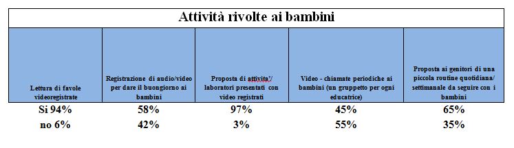Il ricorso alle attività a distanza si è rivelato strumento utile ad alleviare l’isolamento sociale dei bambini, causato dall’interruzione delle attività, a dare opportunità di esperienza ma anche a sostenere i genitori.